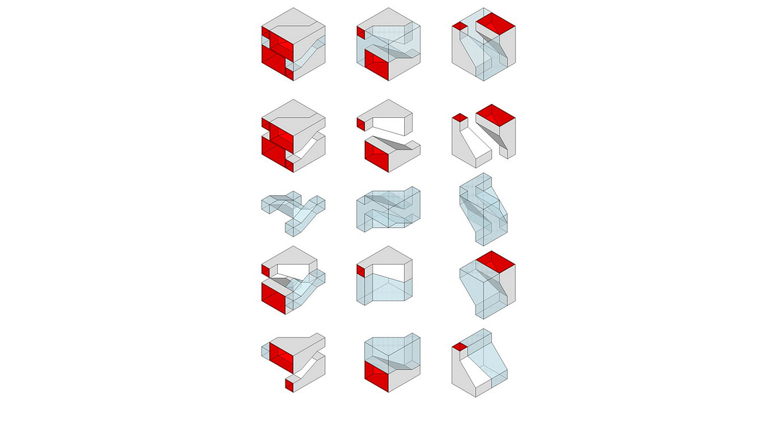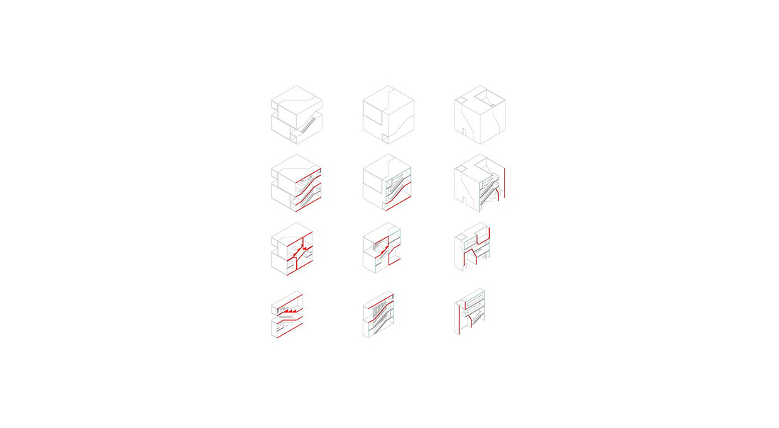 空间将由预制的漏斗形单体通过3维的不同位置变换咬合成3种不同的组合方式,总共有六种不同的生活空间形态。这些漏斗形的混凝土构件隐喻着工厂建筑的空间感,他们可以放在不同的位置构成类似小型剧院,画廊或是更加抽象的类似沉思塔或用于展示的空间。