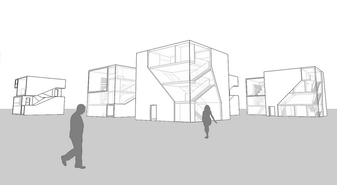 The volume will be composed by prefabricated funnel shape peaces that combined in 3 different configuration types, gives in total 6 type of living typologies. This funnel concrete peace is linked to the memory and the metaphor of factories volumes and can be adapted in different positions so to create small cinema or theatre, or more abstract spaces like towers for meditation and for exhibitions.
