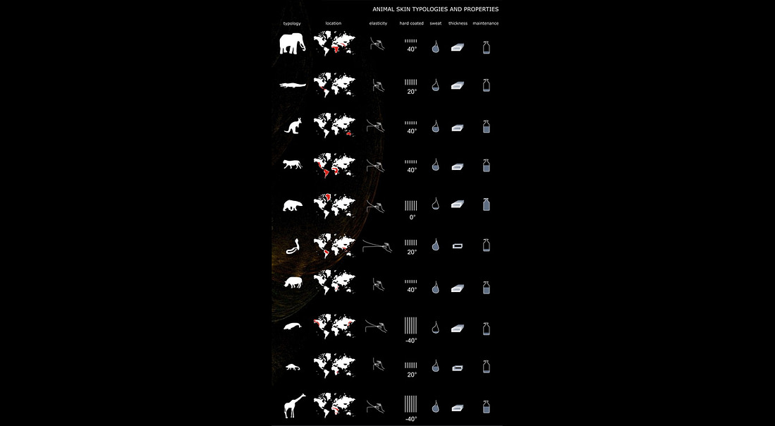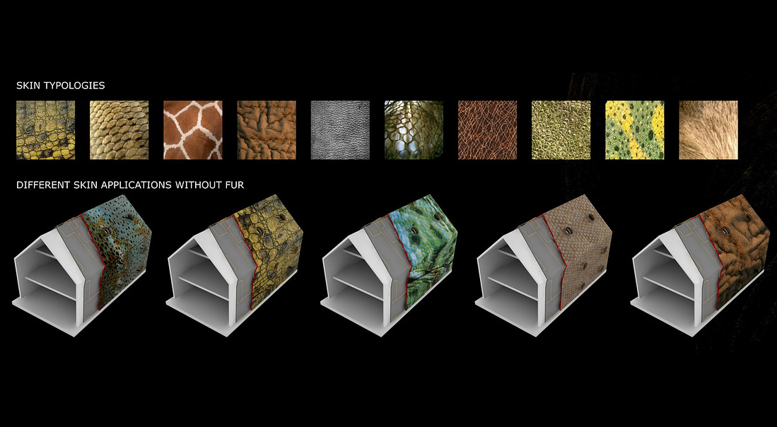 Latitude responsive skin: The skin changes the typology according to the latitude and climate in which the building sites. A typological animal chart helps decide the system for such a transition.
