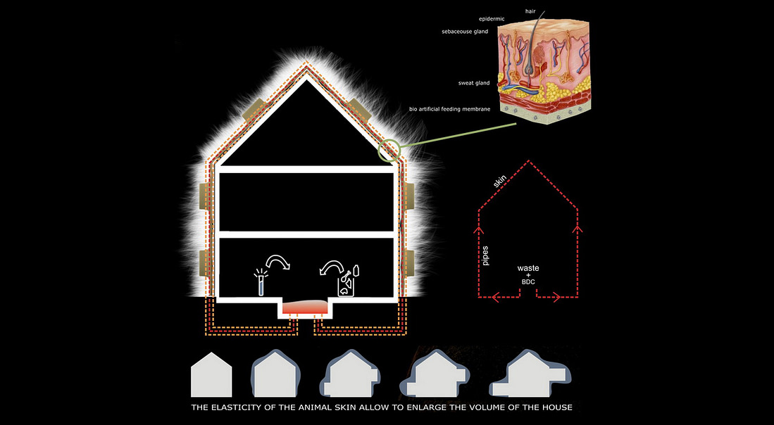 Each building located in different zones of the world will require different properties for the outside skin. We can imagine that a building located in a cold region can use a skin made with the DNA of a sea dog, for its thick fat coat, mixed with the DNA of a bear, for its dense protecting fur.
