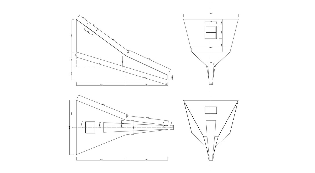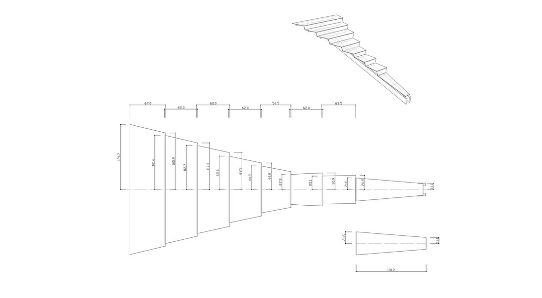 Actually each step or plank would have a different function according to the width or position, to be transformed into a bed, a bench, a chair, a table, or if outside the hut, a theater or a terrace. The skin, made of planks and wooden panels, would be structured to make space for a terraced entrance, a central window and a skylight to be able to look up and see foliage above and at nigh time the stars in the sky.