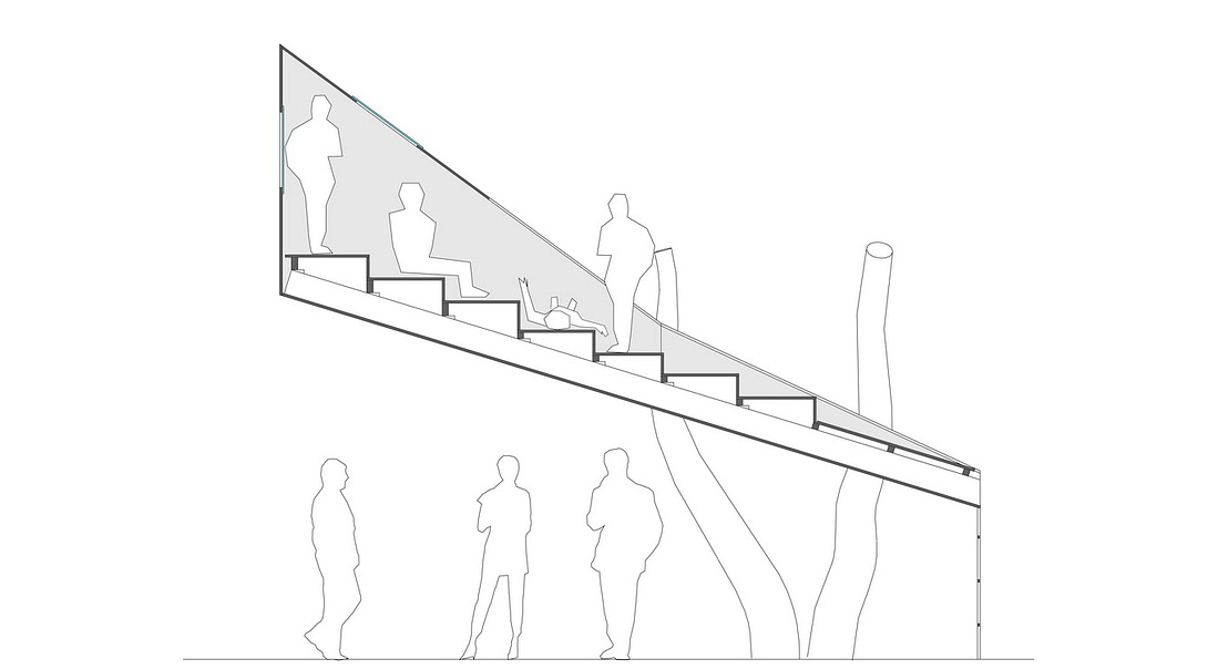 成品是倚靠在树干自然形态上的构筑物,地板是一系列随自然坡度跌落的木板,就像一段一段宽阔的楼梯。
