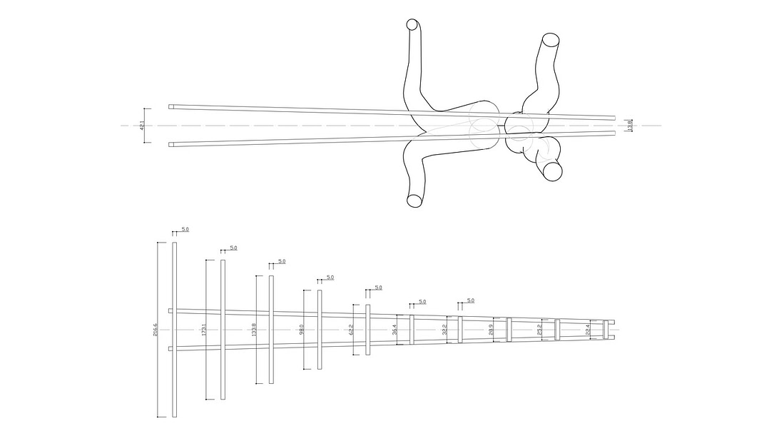 本方案试图利用这两组自然分叉作为基础或者说是底座来架起两根薄木片制成的木梁,木梁出挑仅三米,并在树上构成稳定的三角形支撑结构。