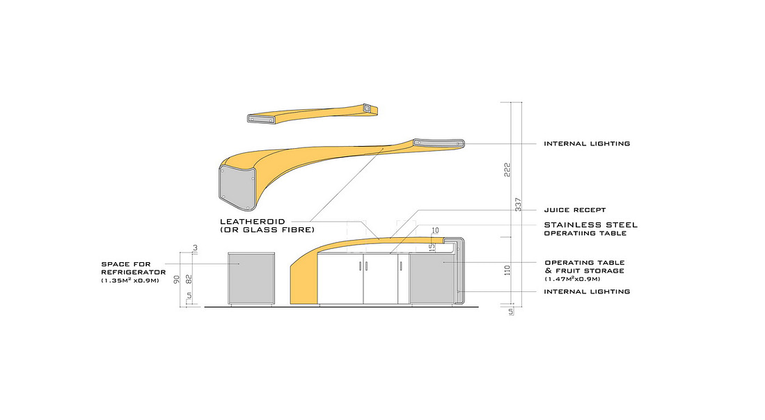 The choice is to use natural colors as the one of the logo, natural material as leather. There are also different options with artificial materials as resin, polycarbonate and fiberglass. Important properties of the material is that have to resist to the usage of bar desk, mainly for juice glasses, and have to be translucent so to feel the lights and led system that will be fixed under the skin to create a pulsing effect of light coming from behind the surface.