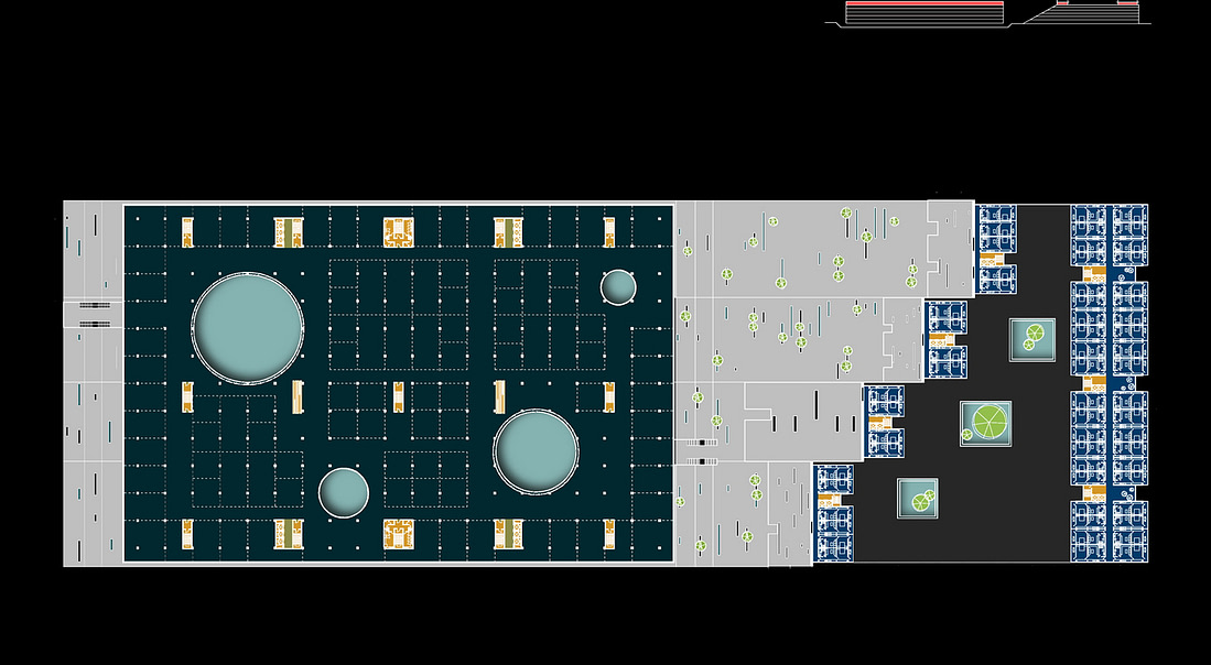 - 开孔的 表皮覆盖了基地的绝大部分区域,这些表皮从头至尾扮演着不同的功能,首先作为地下车库的地面,然后是公寓塔楼的外墙面,最后成为公寓的屋面。