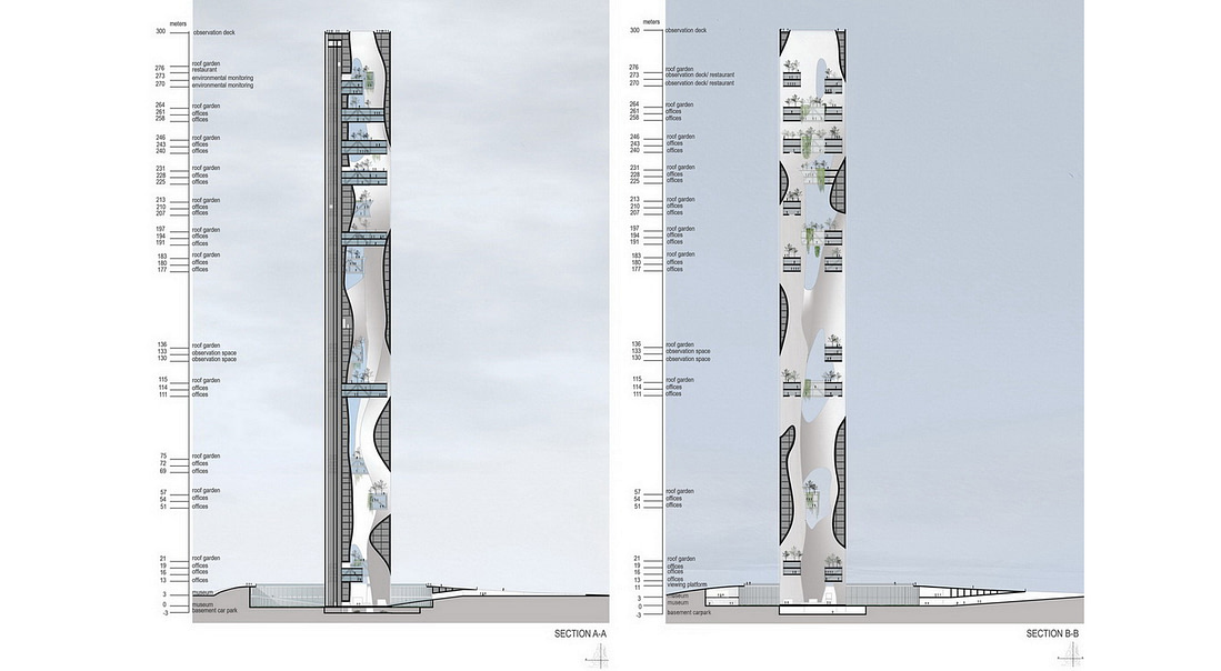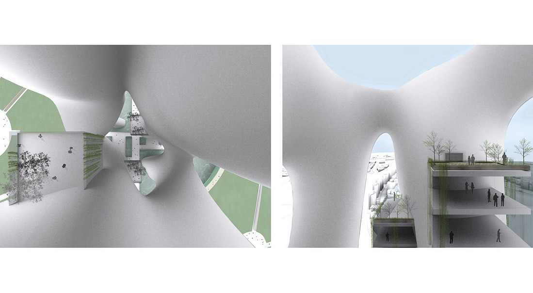 The green element will be dominant in this project, starting from the urban park that enters in the site and covers the total landscape going up to the tower into several floating gardens.