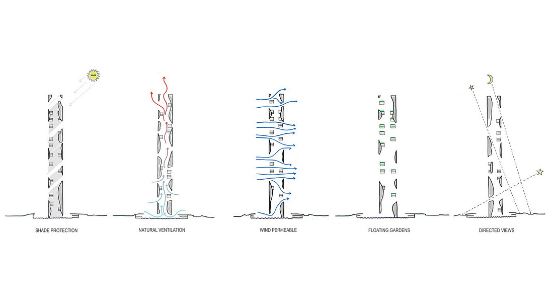 The building will be equipped of an underground geothermal collector that brings into the tower the desired air temperature.