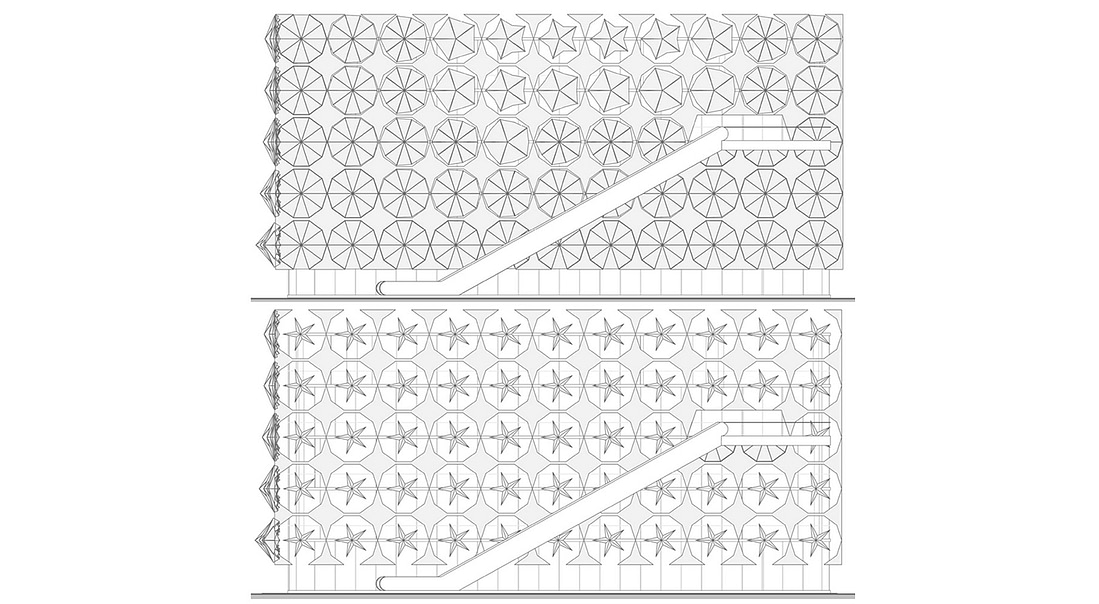 When the umbrellas are fully opened the façade is completely flat so that most of the sun light and strong wind is blocked. If the umbrellas are opened the light is able to come fully inside and the umbrella sticks become attractive star-sticks with an aerodynamic shape not resistant to the wind preventing structural tensions in case of typhoons.