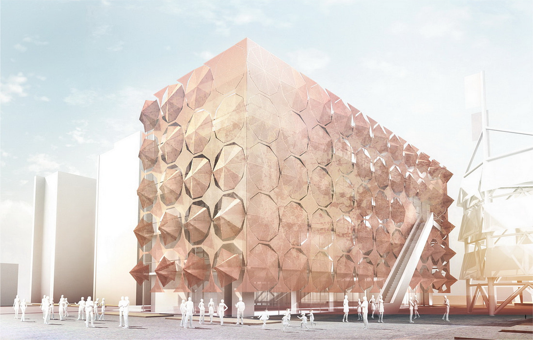 After the 2010 Shanghai expo the Madrid pavilion needed to be renovated and transformed into a commercial building with retail and office functions. The old façade was built around a 1.5m wide terrace all around the building with bamboo louvers mounted on folding steel frames. In 2012 the bamboo got rotten and the frames rusted so the Shanghai Expo Bureau decided to replace the old bamboo skin with a new façade that could work in the same way: allow the people to open or close the shades so to protect glass facade from the sun in summer and allow more light in during the winter. We were commissioned to find an eye catching concept that can follow those functions but also attract more people in the new commercial area.