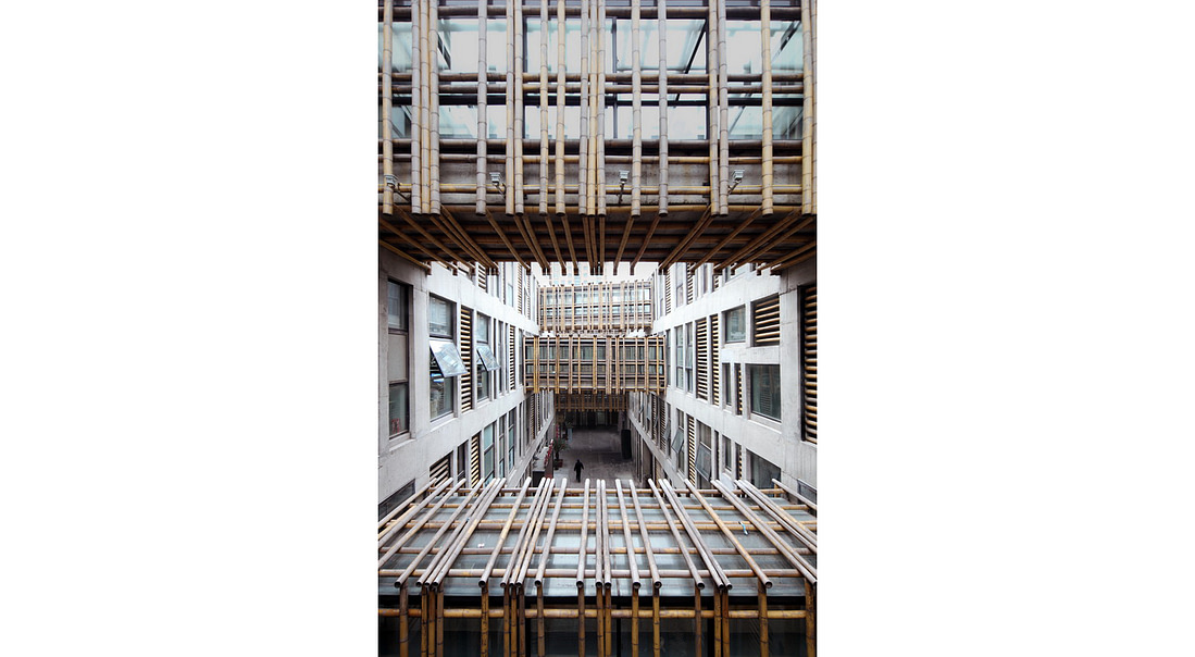 Se digitate su Google Maps le coordinate +31° 16' 9.45", +121° 27' 14.93" vi apparirà la vista zenitale di un edificio rettangolare, caratterizzato da un patio centrale attraversato da ponti pedonali e un muro rosso lungo e fiammeggiante, che separa gli ambienti interni dal rumore della strada sopraelevata fronteggiante.