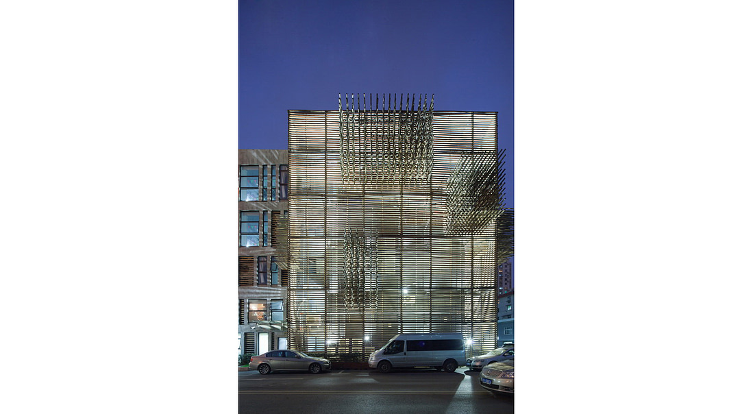 Le altre facciate minori, in parte destinate alle apparecchiature tecniche, sono state celate dietro una seconda tessitura, un motivo di pannelli in bambu caratterizzati da diverse dimensioni e aggetti, in modo da determinare, anche in questo caso, una percezione scultorea dell’involucro e lo spessore necessario all’ombreggiamento e raffrescamento dei macchinari retrostanti.