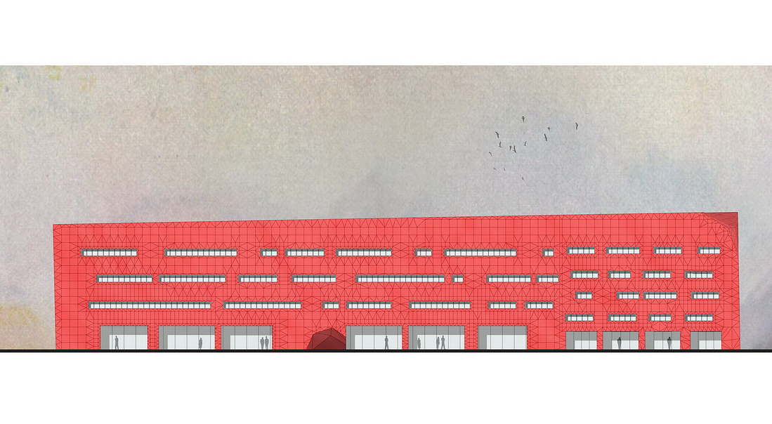 “红墙”的主外立面是由一个狭长的红色铝板组成,呼应了对面高架桥上充满动感的车辆内部能动力。肌理方面则使用了大小尺寸各异的不规则三角纹理做了处理,这样直接又有冲击力的设计灵感是源自于一款主流3D模型软件的图形界面,并对其经过建筑换位思考后诞生的。事实上“红墙”的主要外立面是完全二维的,然而这些形状各异的图案却恰好意外地“救助”了这样的单薄感,并对其产生了一种独特先锋的光学网格效果。