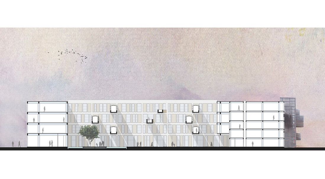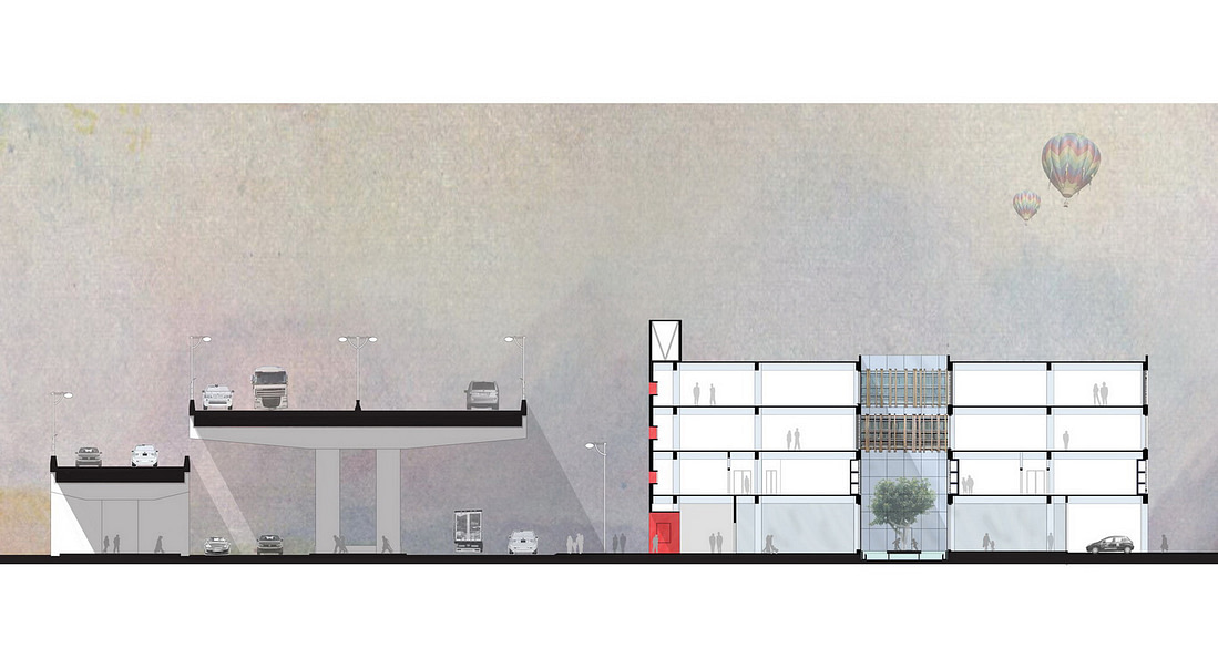 The main façade is a long composition of panels in red aluminium, triangular in form, intended to be perceived as in movement from the interior of the vehicles that transit the elevated road on the opposite side.