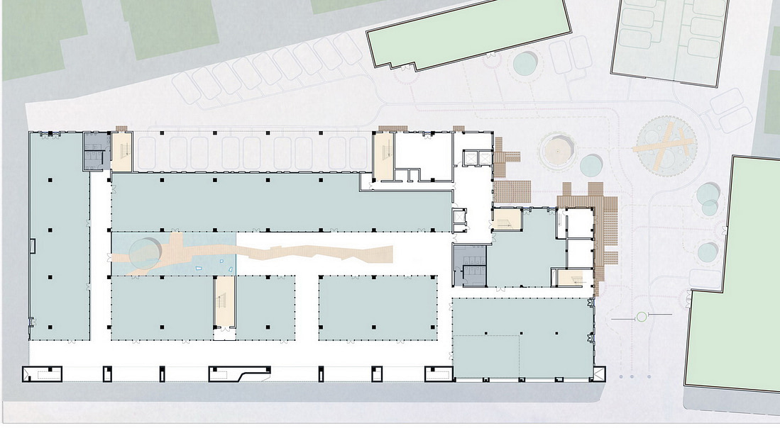 Il progettista italiano ha pertanto proposto uno schema semplice: un volume regolare di quattro piani, con un vuoto centrale indispensabile per illuminare gli spazi dei livelli superiori, destinati agli uffici.