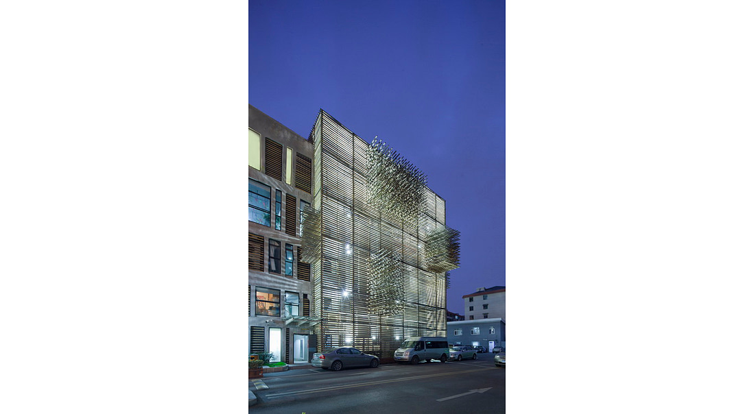 这组设计的附墙被一面“竹排”覆盖遮掩了起来,而它则注定要更好的承载一些技术方面的设备。这面“竹排”的特征是,它拥有不同尺寸围度的竹子,并统一地向外延展开来。这样的设计造型赐予了附墙外立面一种雕刻般的立体感,而其总体呈现的宽度与间隔则对设备起到了良好的遮荫和隔热效果。