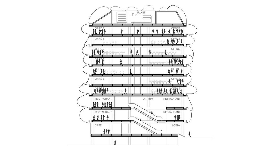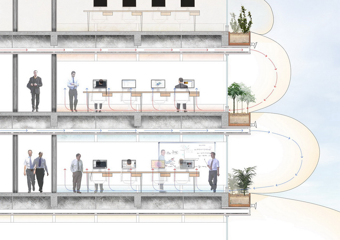 The bubble façade will not be a static façade, it will oscillate with the wind and will interact with its inhabitants: the inflatabels will be in full tensile capacity when many people are working and the ventilation is at its maximum. When no people are in the room the sensor will switch the ventilation down to its minimum and the facade will become almost deflated.