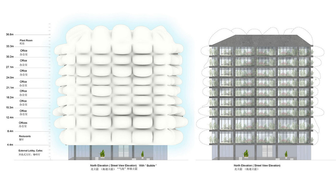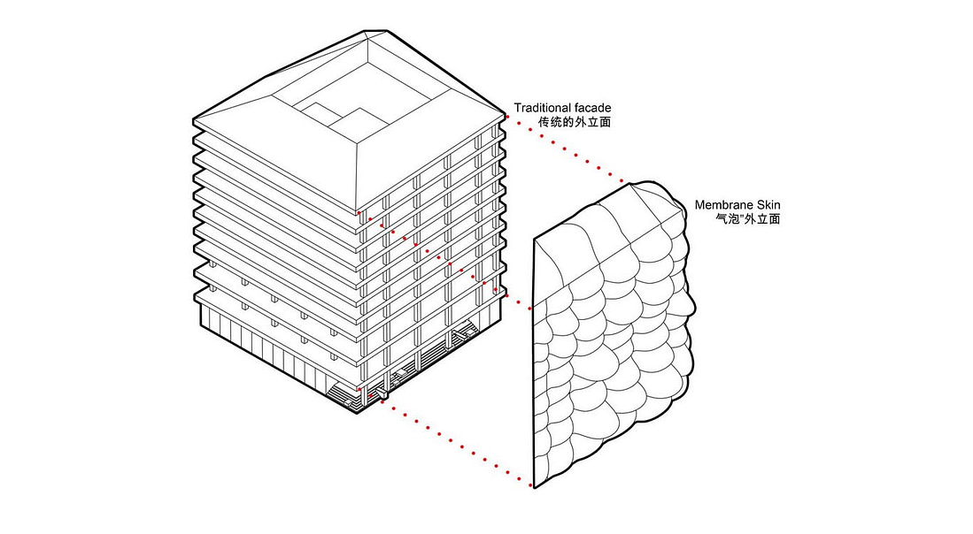 “气泡”外立面会随风摆动,并不是静态的,建筑内部人流量和空气流量最大时,“气泡”膨胀。没人和通风量最低时,“气泡”收缩。