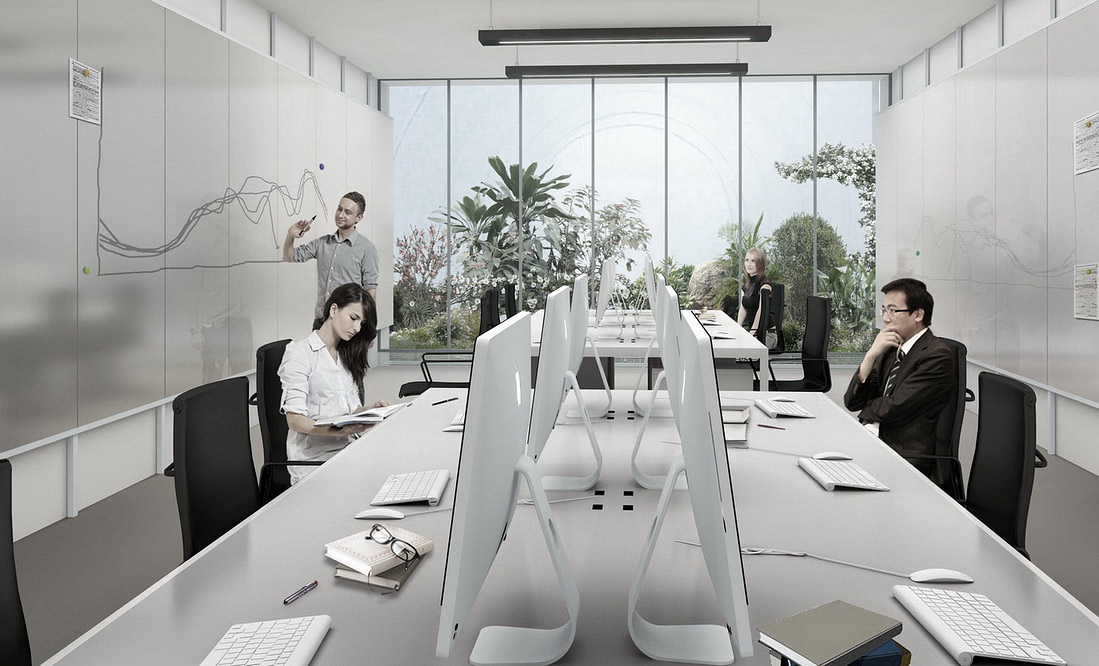 建筑内部将运用一体式的设备完成换气,通风温度调节和过滤的动作,以保证室内的气压平衡与适宜的工作环境,采用传统的出入口和通风口也可行。