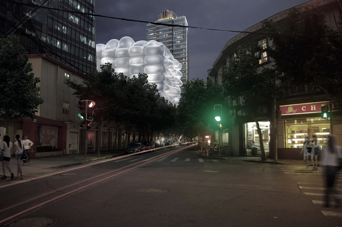 从罗马移居到上海后,在环境上我发现两地有着很大的差别。大概是由于灰色系建筑群和天空,以及大气污染的缘故,我觉得打开窗户,窗外风景并不如罗马这般干净舒服。晚上的状况好一点,因为夜色使得外景显得颇为沉静。我对光线问题很敏感,偶然发现透过磨砂天窗看外景更舒服,也许这是因为我想象光是从蓝色天空透来的,而不是灰色天空。恰好这种体验也成了本次项目的灵感来源。
