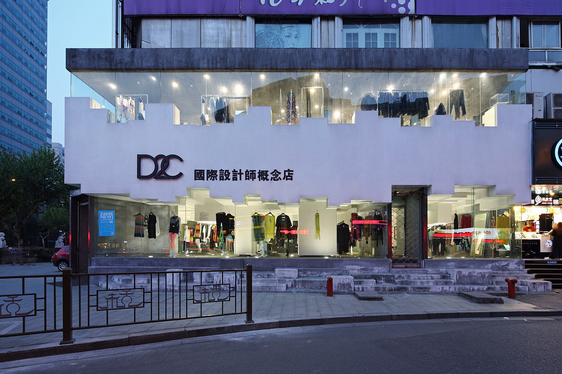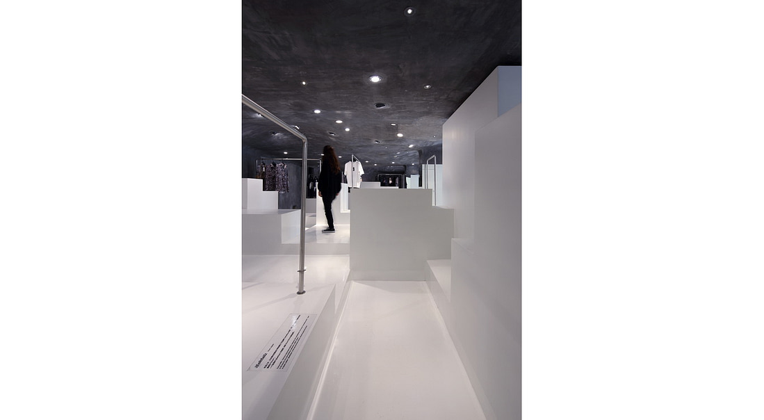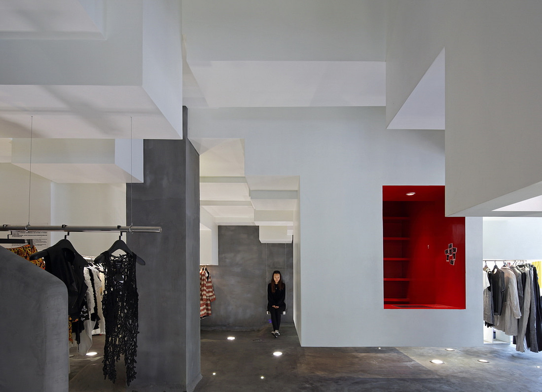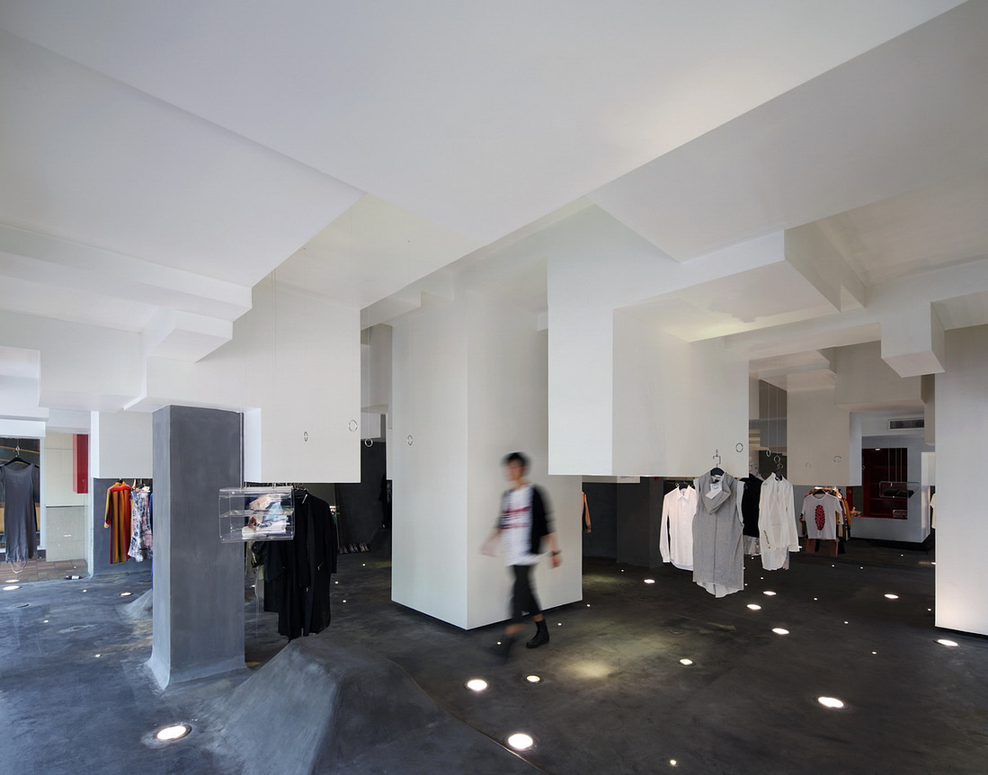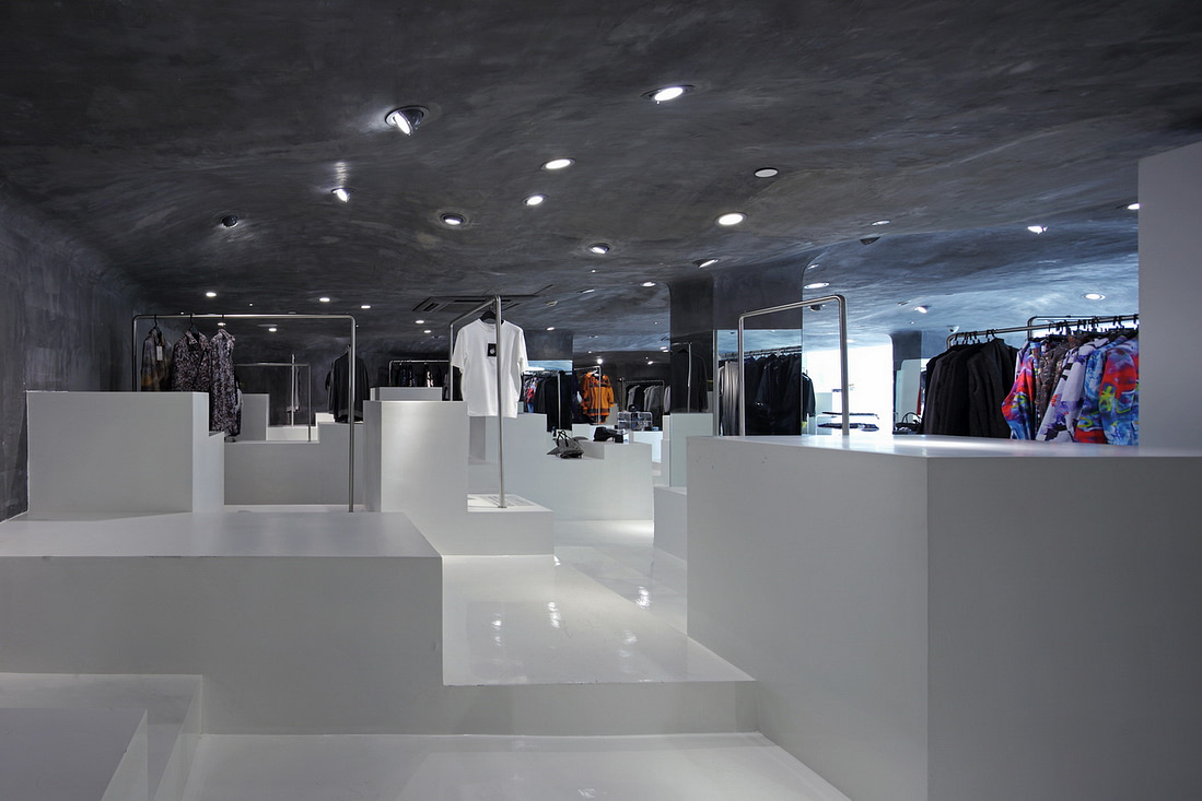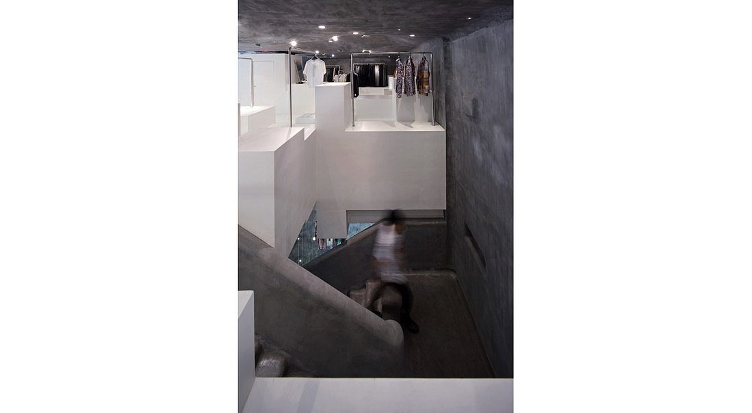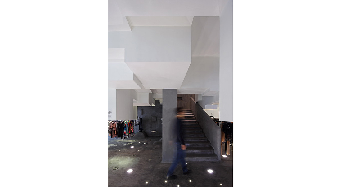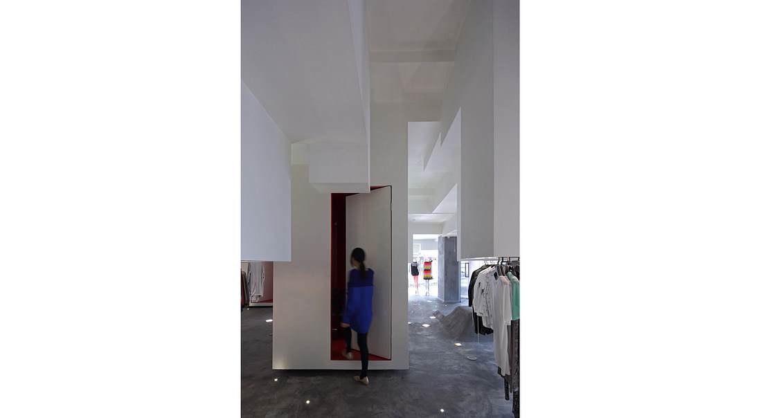 另一方面,也有很强的识别度。行人走在街上便能对重塑的楼板一目了然。其高低曲折构成的线条不仅对外观构成装饰,且使顾客从店外透过玻璃墙便能明确看出店内的这种模仿地壳运动的地形。从底楼进入实体店后,顾客将置身“地壳运动”的下表面,行走于对天花板切割后形成的各种空间内。切割深度、广度的不同,形成了不同的空间:试衣间、收银间、商品展示区,或纯粹从天花板上挂下的不接地的墙壁和显示屏,营造迷宫的效果。