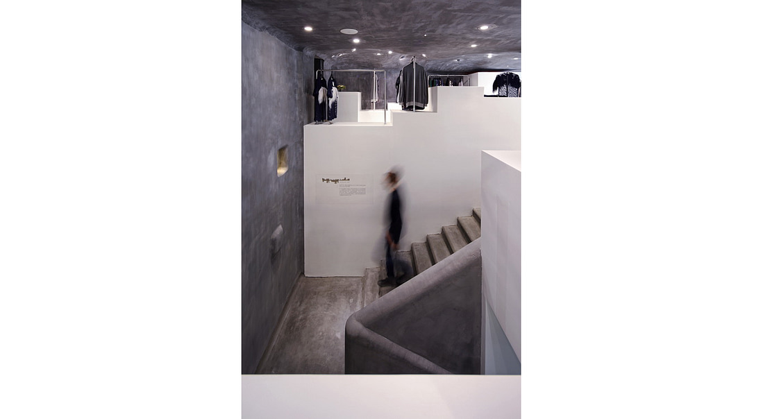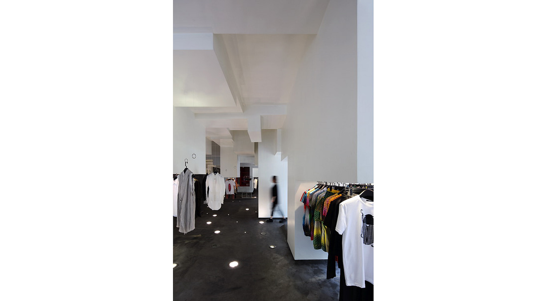 This simple idea creates a very strong identity of the shop; even coming from the street is possible to see immediately the reshaped slab on the building façade. This squared skyline is not only a façade decoration but you will notice immediately from the glass window that is actually the shape of the slab that will continue inside the store. Entering from the ground floor will allow you to be under the squared slab, you will walk between the extruded volumes that come from the ceiling creating different functions depending on their shape and size; fitting rooms, cashier room, clothes or swing hangers areas or just simple screens and labyrinth walls that coming from the top never touch the ground.