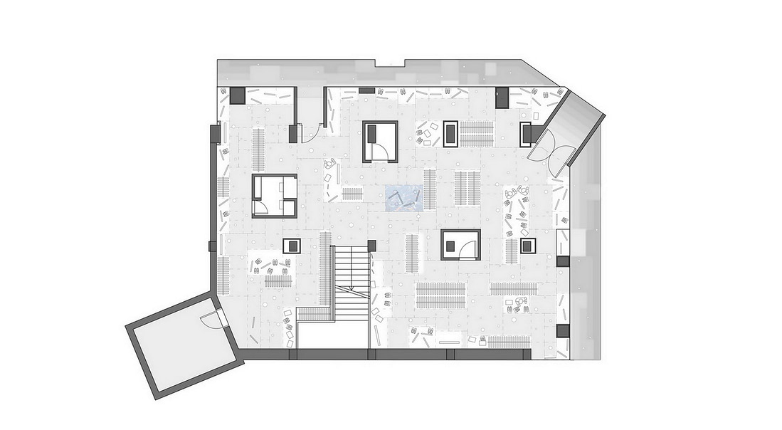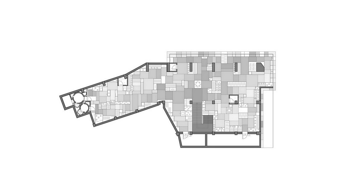 地壳运动的概念十分简单,亦即在现存楼体中模拟地心热能所产生的地壳运动对楼板进行重新塑形,以此构造一个两层楼的购物空间。