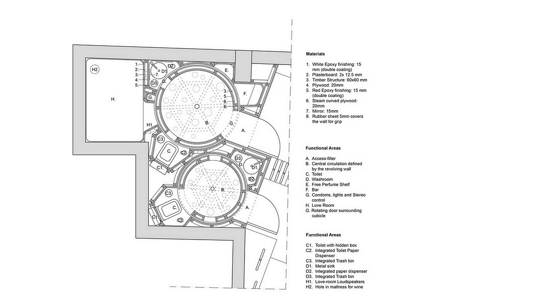 这一空间为需要使用盥洗室的顾客设置了极具趣味的挑战:在洗手间的门后,顾客将发现一面有弧度的橡皮门,推、拉都无法将它打开。聪明的顾客将发现这是一扇装在弧形墙面上的移门。移门打开后,顾客将发现一个门洞,进入后,置身环柱空间之内的顾客,如滑移门洞,将依次发现马桶和洗手池。继续滑移门洞的顾客还将发现情侣房:内部配备吧台和避孕套。