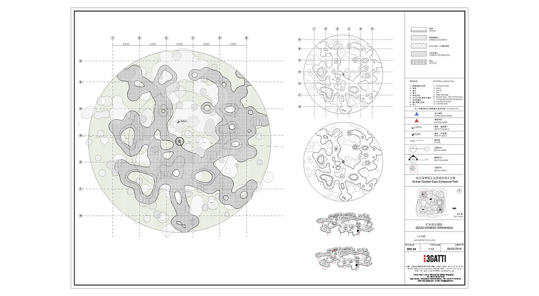 The general landscape will be made of circular holes pattern carved on the new layer of soil that will cover the original hill. Each hole will contain the garden/pavilion of a different country.