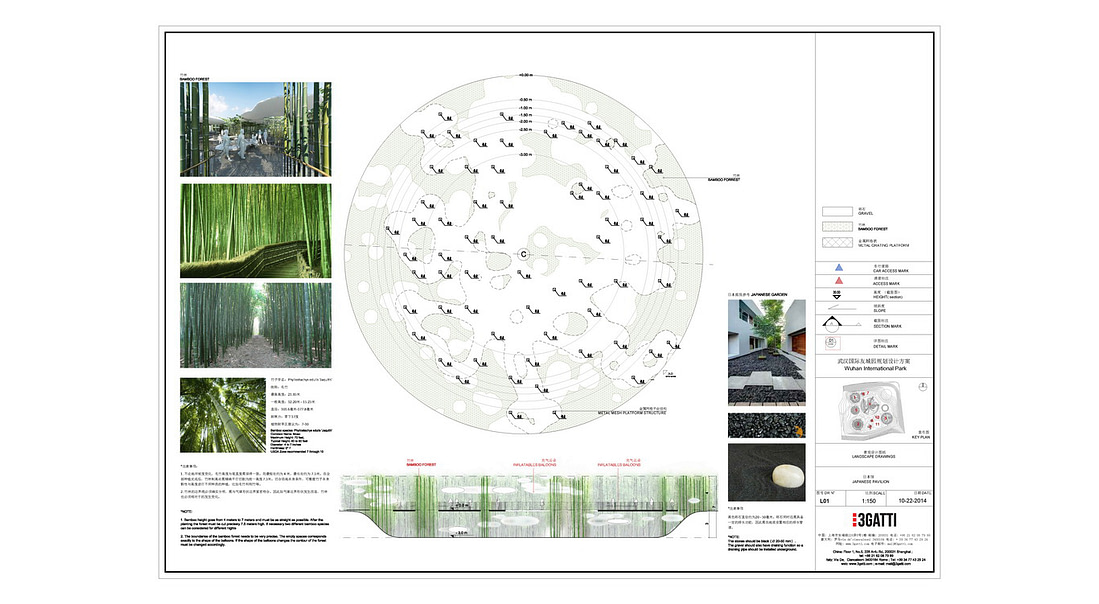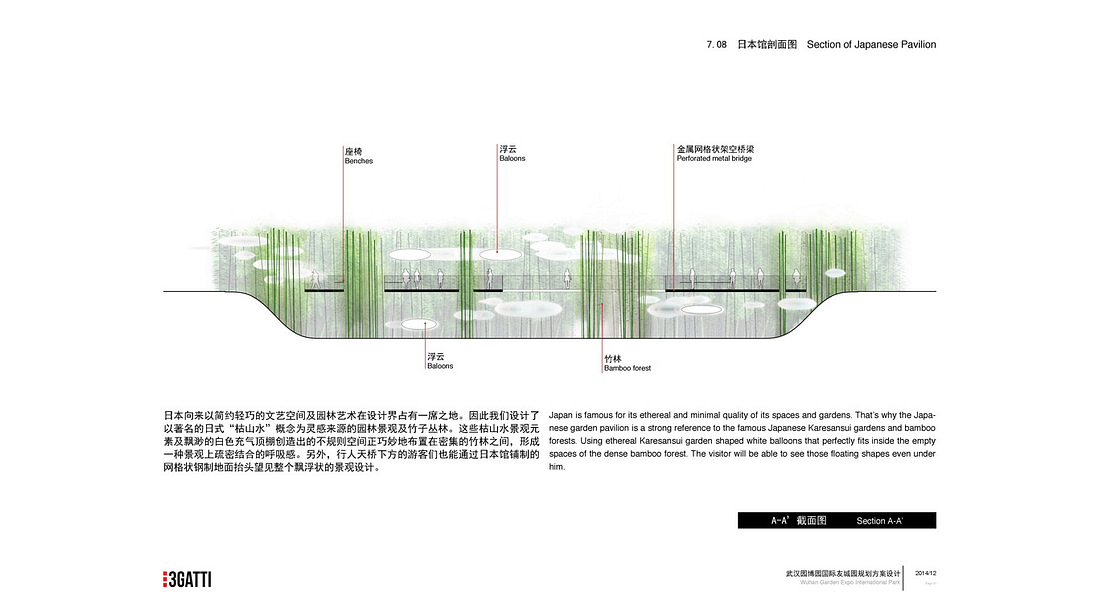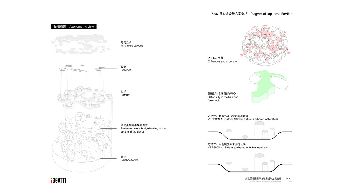 The more interesting design is for sure the one for the Japanese Pavilion inspired by the Zen garden and the meditation concept. The plan layout is a precise fixed overlap of three layers made of dense bamboo forest, helium white metaballs balloons and perforated metal bridges.