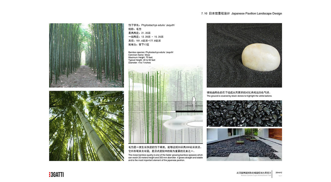 其中最为出彩的是从日式枯山水园林和静心冥想所得到灵感的日本馆。整体展馆平面外围由紧密排列的竹林和设计巧妙的充气“浮云”变形球体所包围,再结合冲孔金属桥梁作为穿行区域。