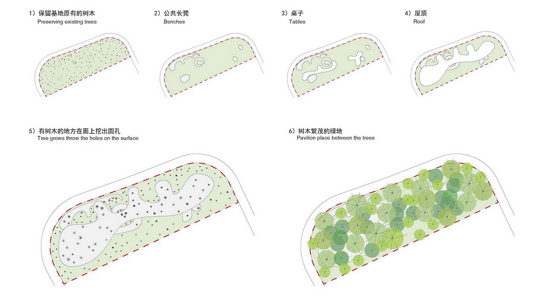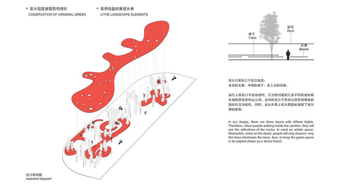 我们所设计“丛林家居”将被解构分为高低三层:从至高层的遮蔽顶,到中层桌面区,最底层的长椅区。主要的设计亮点在于流畅圆弧状且极至轻薄的铝面效果,不仅在立面视角看来近似于无形,同时通过铝材镜面反射的效果在各方位都能“模拟投射”现场环境,最终创造出溶于景色中的自然丛林家居景观设计。所有的三层铝面将在现场进行穿孔拼接,以保证树木能切实穿透景观构筑物,从而最大限度的保留绿色现有景观。这样的做法将把丛林视角划分成两等分:铝面反射下斑驳层叠的树干树枝,高于铝面遮蔽顶郁郁葱葱的绿色枝叶。
