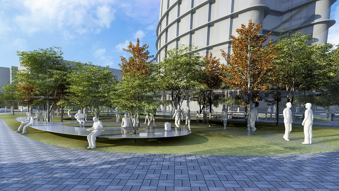 该街头景观项目的主要目的是为了保护现有道路旁的树林美景,并且进一步服务同一区块即将建成的摩天大楼用户。