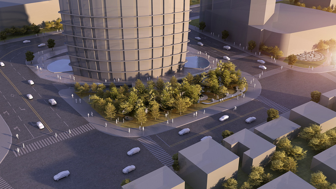 The idea for this small landscape is to preserve the small existing forest next to the main road and add all necessary park equipment so to serve better the future high-rise office building that will rise in the same block.