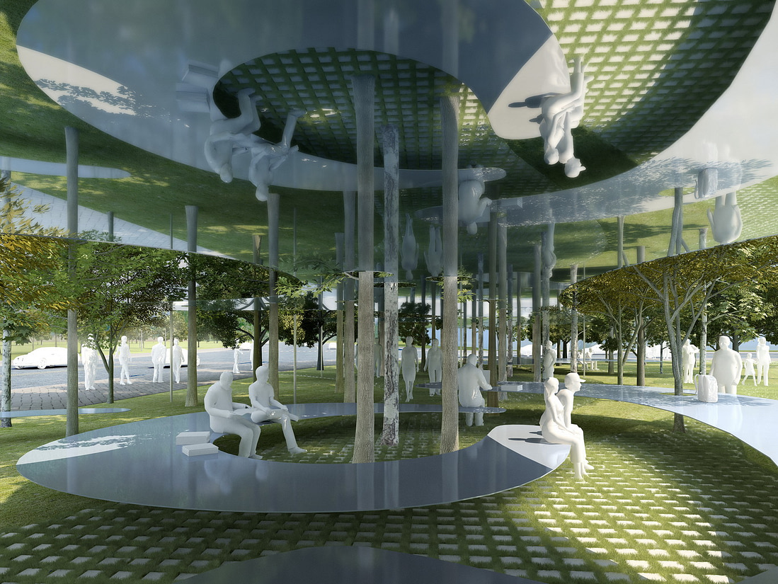 The idea is to create very thin rounded mirrored aluminum surfaces so to be almost invisible in elevation and completely mimetic because of the environment reflection. All those three levels surfaces will be built on site holed so to make each tree able to pass through. This will divide the view of the trees in two areas: the lower one where you will see the naked trunks reflected and stretched by the roof mirror, and the upper one where there will be all the trees leaves.