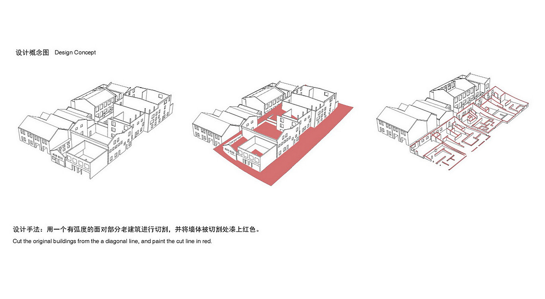 我们的设计策略是尽可能的保留现存楼房或者粹取出最有记忆点的建筑元素。因此,我们将对整片建筑群进行概念化科学化的斜向“切割”,从而去除建筑上半部分,只保留下半部分现有的特色墙体。通过如此设计手法,我们不仅展示呈现了最原汁原味的房屋平面布局,同时还加入一些新的分隔墙体以此来制造出新颖又趣味十足的“迷宫式”空间。