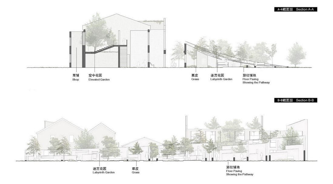 通过如此斜向切割的设计手法,靠近道路的部分到保留建筑元素的部分有一个渐起的升高,从而使置身其中的人群也有从都市一瞥到庭院深深般的渐变视觉冲击。另外,在保留建筑元素的侧边我们还会填充入一些天然的土壤,这样能让树木植物从二楼镂空处自然的生长出来,并创造出一个在都市钢筋水泥丛林中的高层绿色生态小庭院/露台。