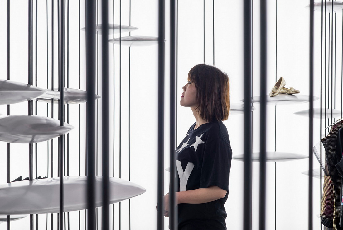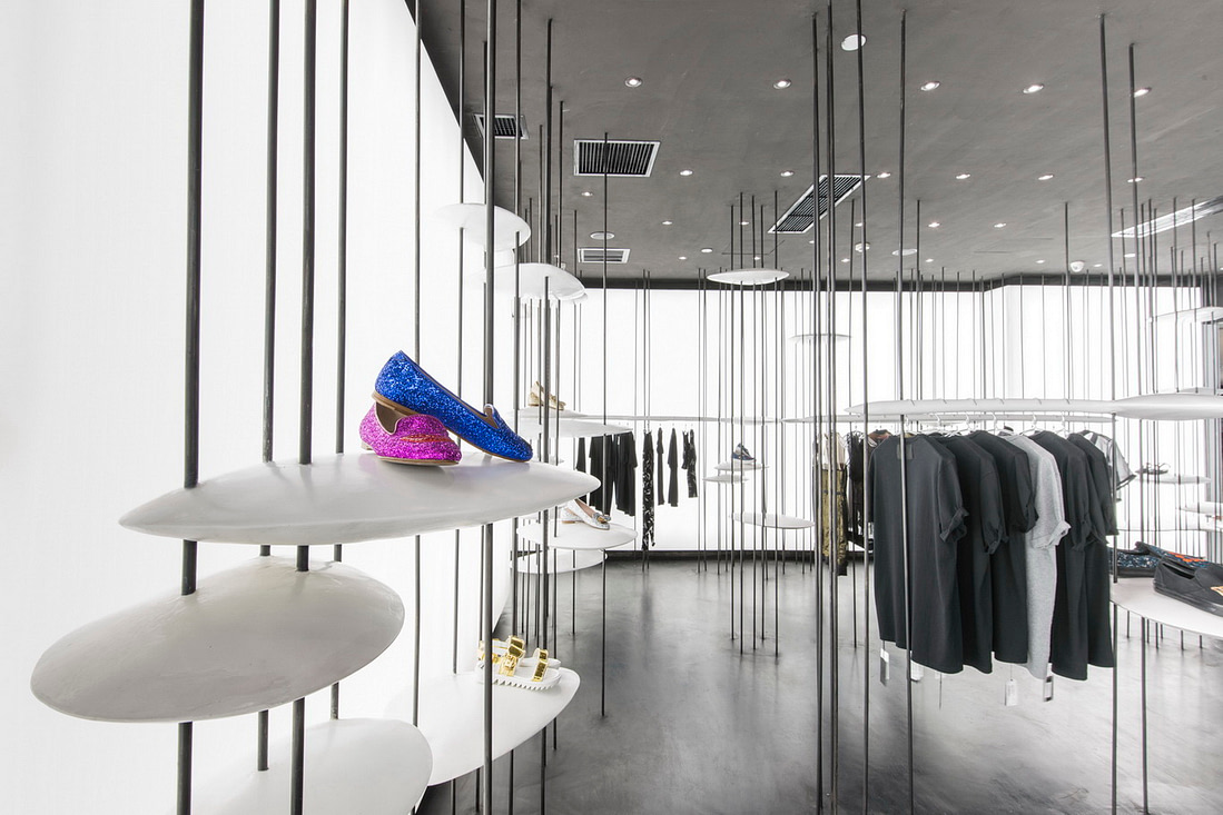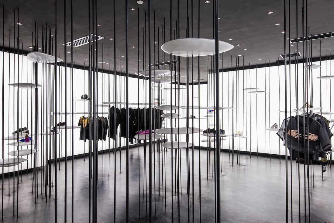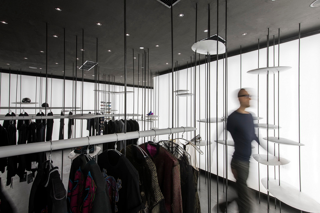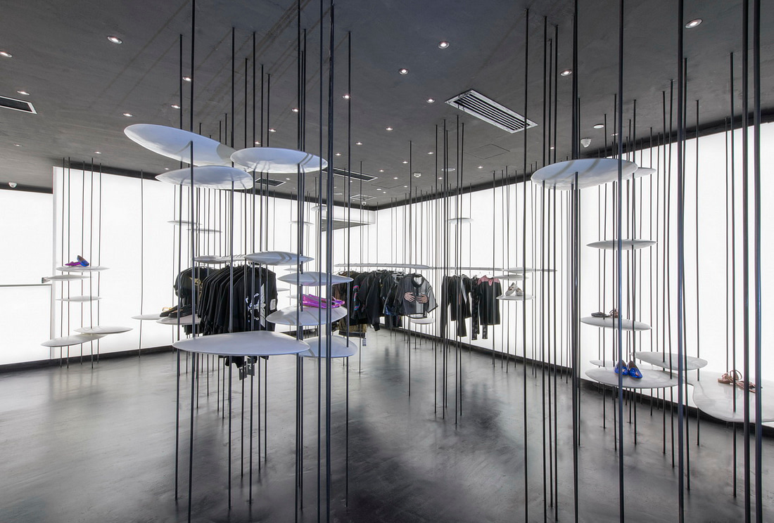 由于竖向线条带来了便利性,我们便在其上安置了带有设计感的UFO状圆盘。这些圆盘不仅能给包袋鞋子的展示提供了绝佳的平台,变化增加大小和强度后还能提供实际功能,例如座椅,或服装展示架等等。