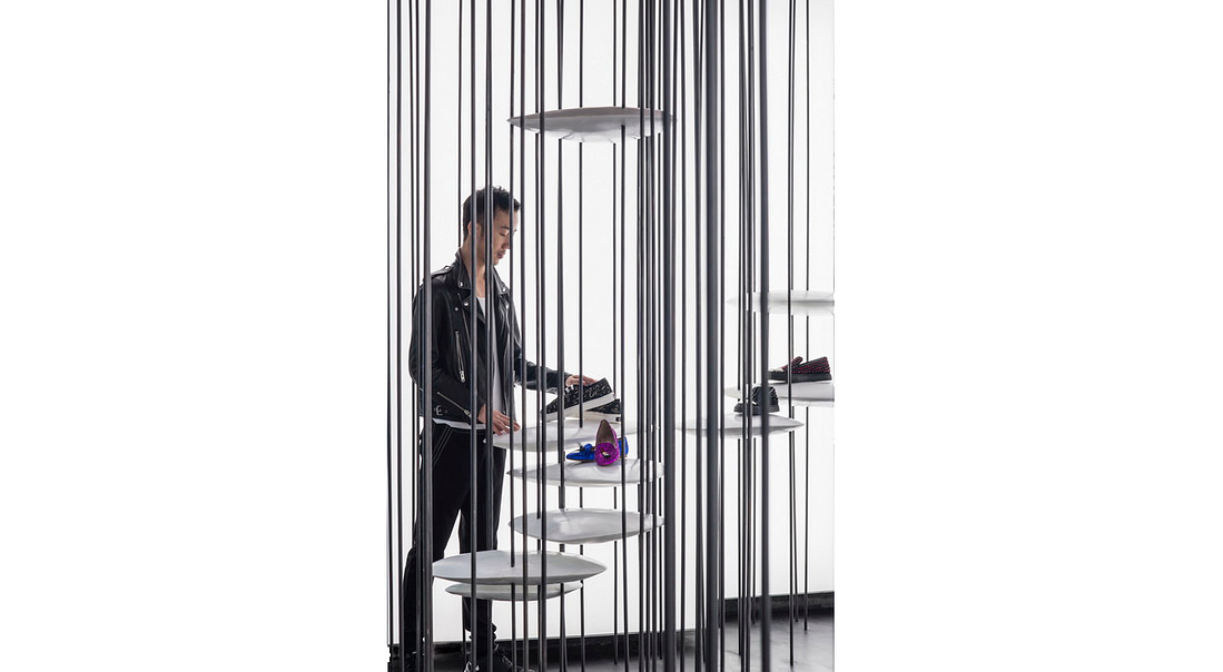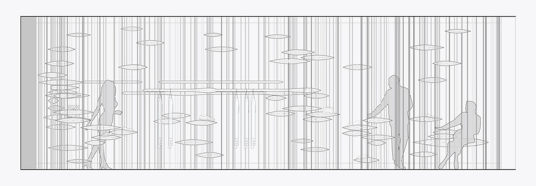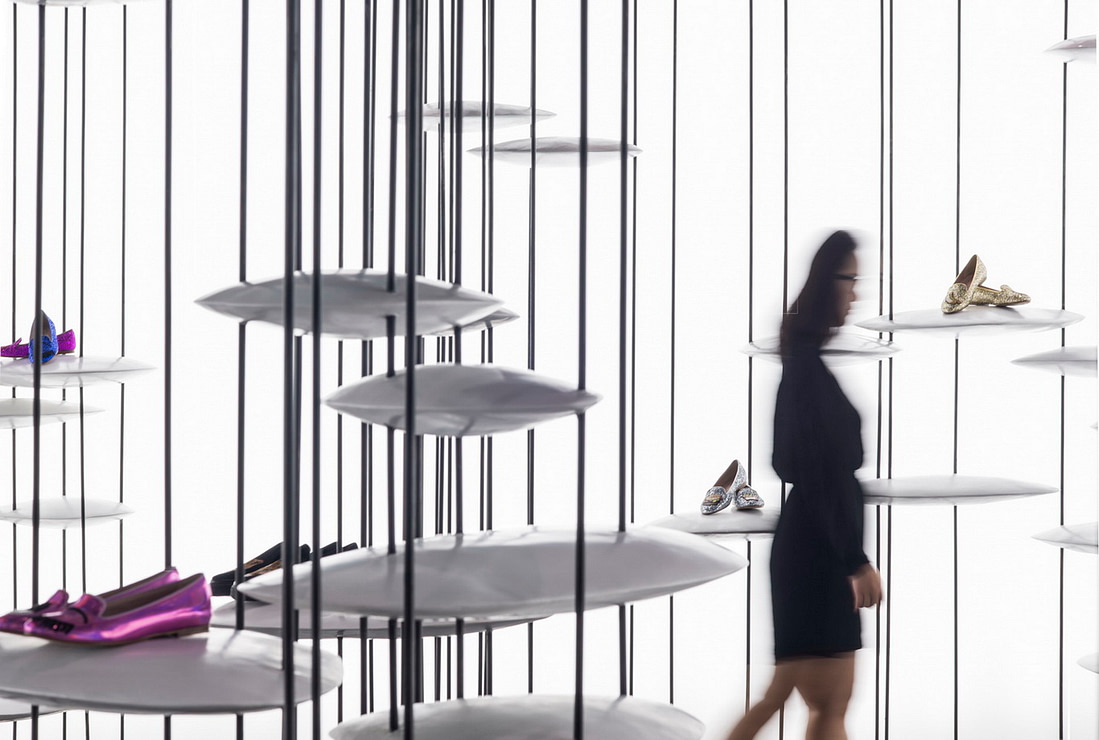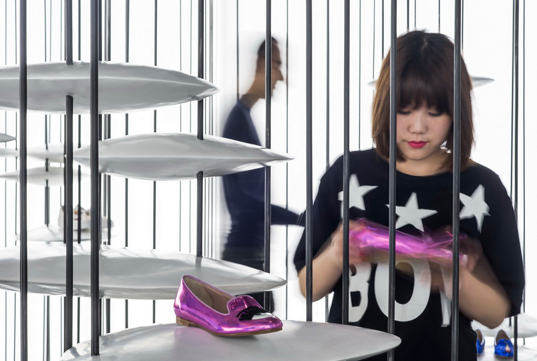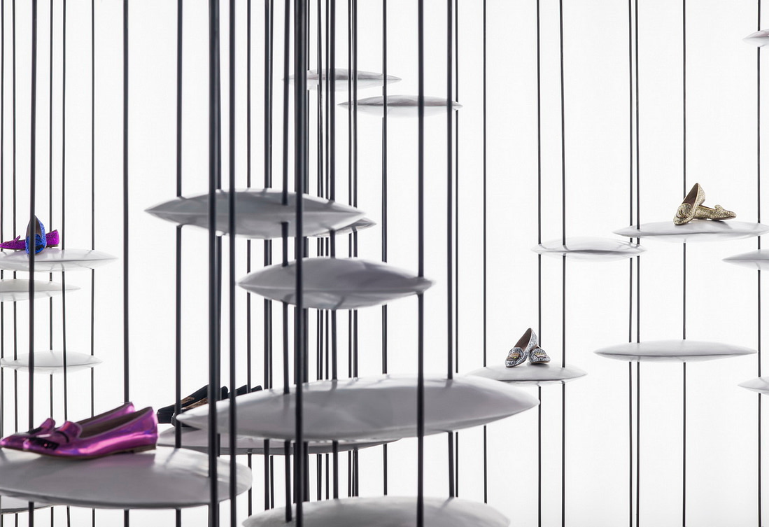由于竖向线条带来了便利性,我们便在其上安置了带有设计感的UFO状圆盘。这些圆盘不仅能给包袋鞋子的展示提供了绝佳的平台,变化增加大小和强度后还能提供实际功能,例如座椅,或服装展示架等等。