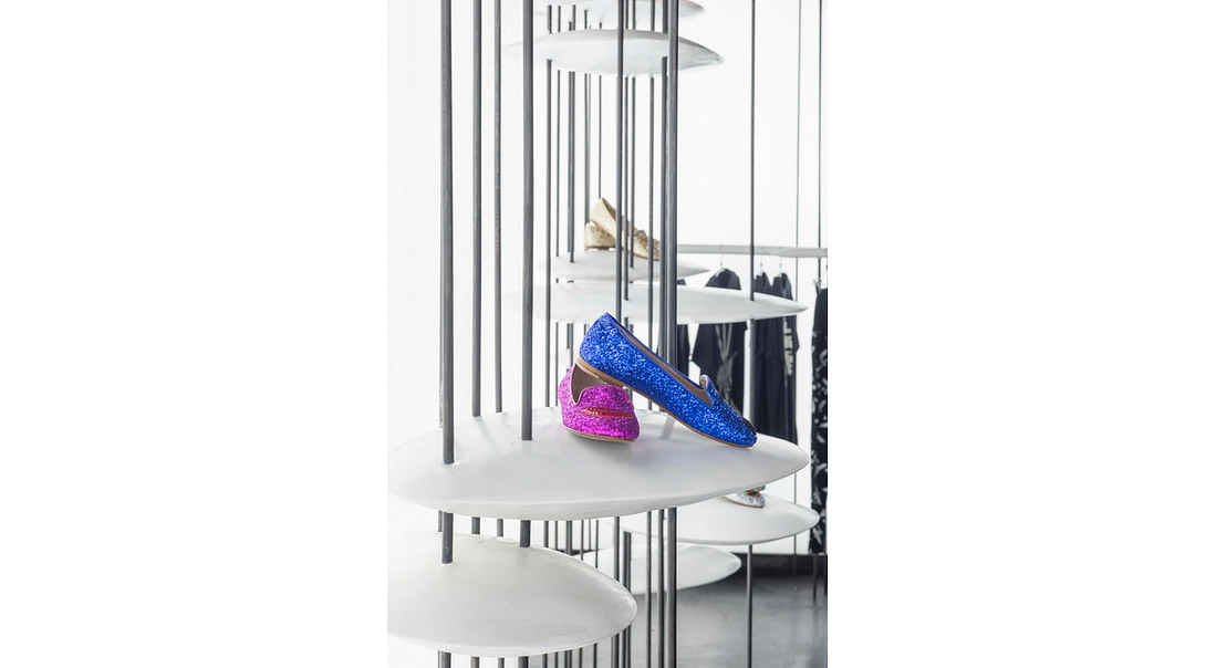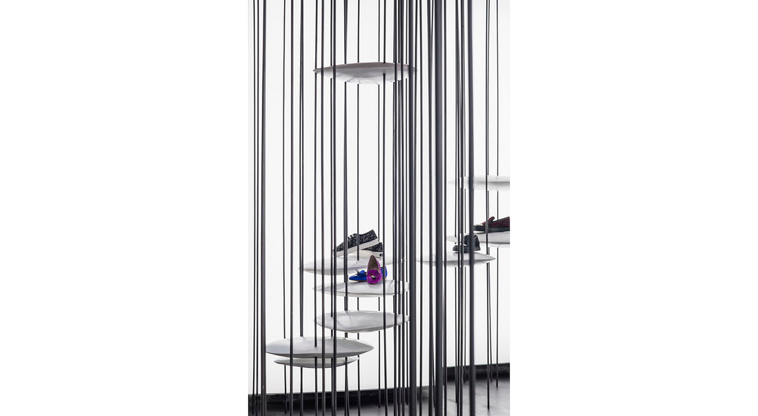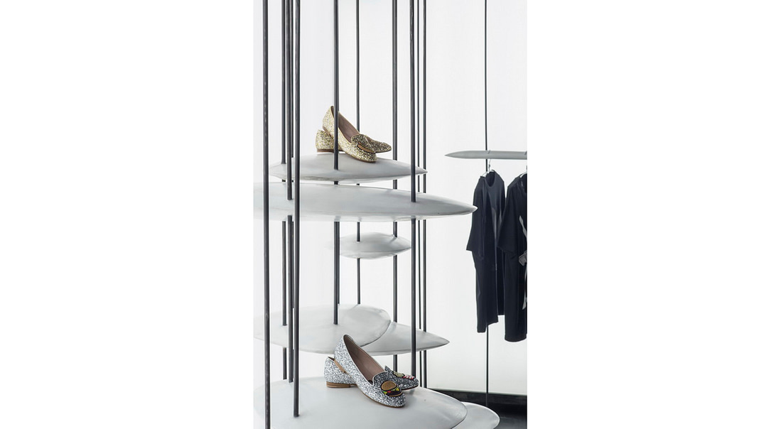 Thanks to the vertical elements was possible to fix disc shaped elements all around the shop so to create surfaces where to display bags and shoes or where to sit on the larger discs and where to hang the clothes on the craned discs.