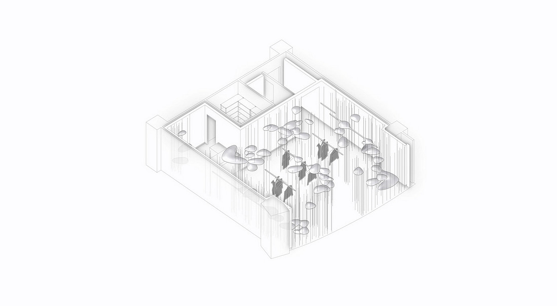如果一定让我对该项目进行理性地解析,我想此个设计主要创作思路是通过疏密相交的竖向铸铁管来进行空间分割,并模拟建造出充满美感及丛林般的购物环境。为了凸显强调竖向的线条且更具视觉冲击力,我们会于店内四周使用特殊的发光膜墙体从而创造出超现实感的斑驳光影效果。
