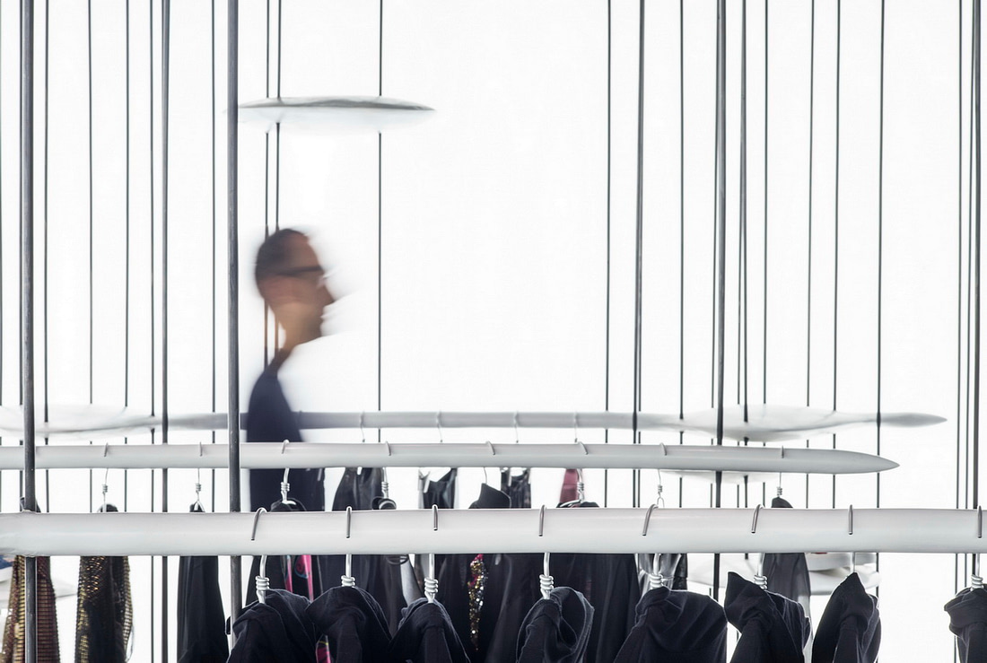 If we have to analyze it rationally I will say that the main idea is to create dense areas of vertical steel bars so to define the space but also the aesthetics and the forest-like abstract image of the store. To increase the contrast of the vertical lines and make its perception more powerful we used barrisol light walls all around the shop creating also a surreal erosion of the shadows.