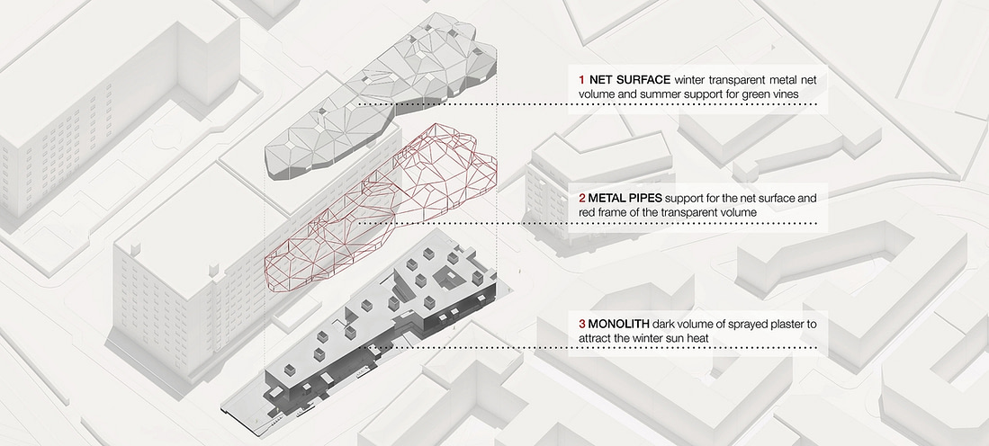 Il volume sottostante alla rete è una semplice costruzione in muratura cieca, spruzzata di intonaco di color grigio scuro. In questo modo nei mesi freddi, in assenza della pelle verde, i raggi solari andranno a colpire la superfice scura e rugosa della biblioteca, andando ad aumentarne la temperatura.