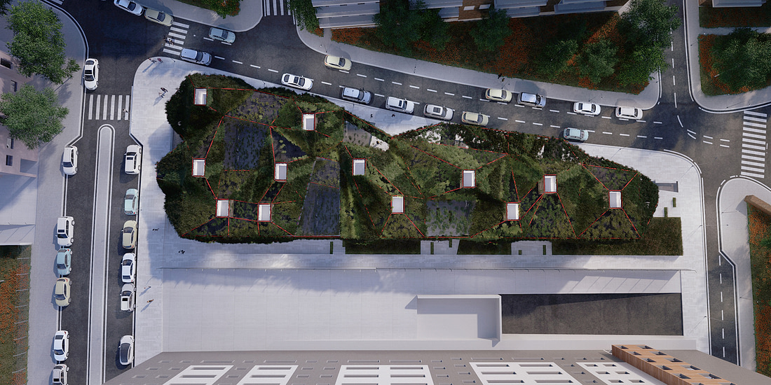 The green space resulting on the intervals in-between the courtyards and the space in the eastern side of the site will be dedicated to the development of urban vegetable gardens. Those gardens will be attached to the kids library rooms so to stimulate the interaction between the two areas and the education related to the vegetable world.