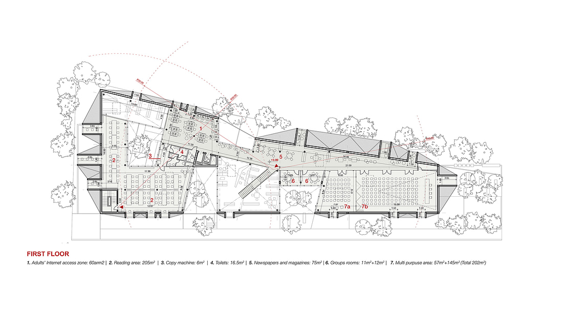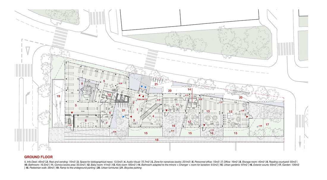 The street front of the building is moved backwards from the site limits so to give more public space and a spacious access to the library main entrance.