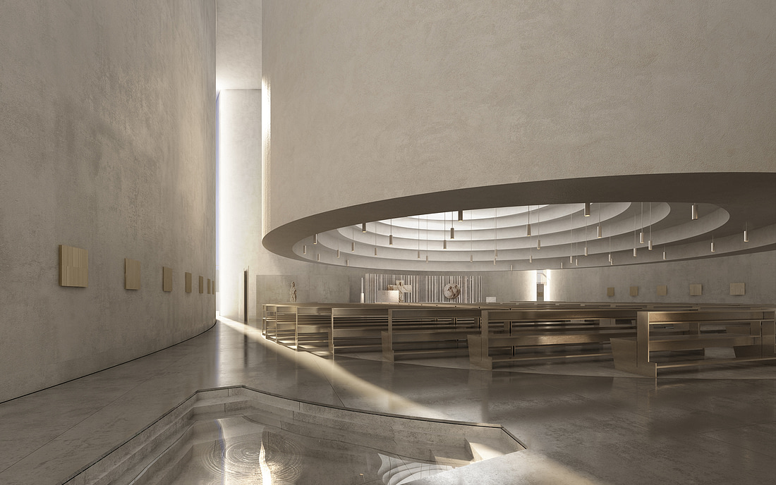 Corners light cuts, placed in the liturgical poles, emphasize, the processional space that has as in its core the faithful congregation. A central cylindrical volume with a series of interior concentric rings ends with a wide opening that radiates light into the celebration space and brings the disciple of Christ to the encounter with God through a progression towards heaven, concretizing the concept of transcendence.