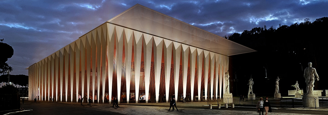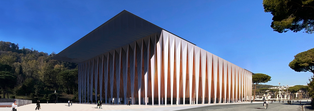 A folded structure, a tribute to Pier Luigi Nervi, which supports a kinetic roof perceived from the outside as a sheet of paper that magically flows over the building.