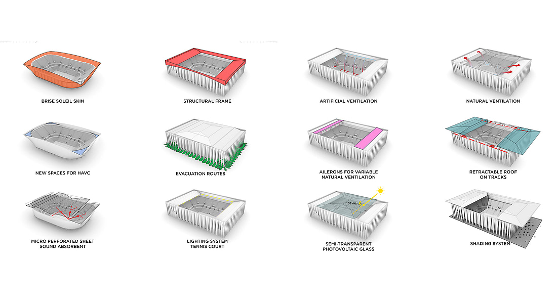 Once inside the court, the design change completely and the rationalist drama of light and shadow is transformed into an exciting high-tech space. A tennis cathedral with natural light filtered from above through a complex system of semi-opaque photovoltaic screens, spatial reticular structures and wire mesh; a technological package that serves as a container for the numerous systems necessary for the proper functioning of a space that can be adapted to different climatic and use conditions.