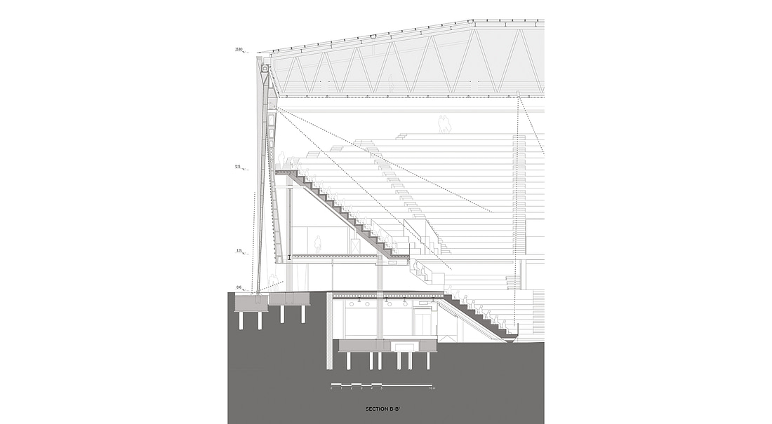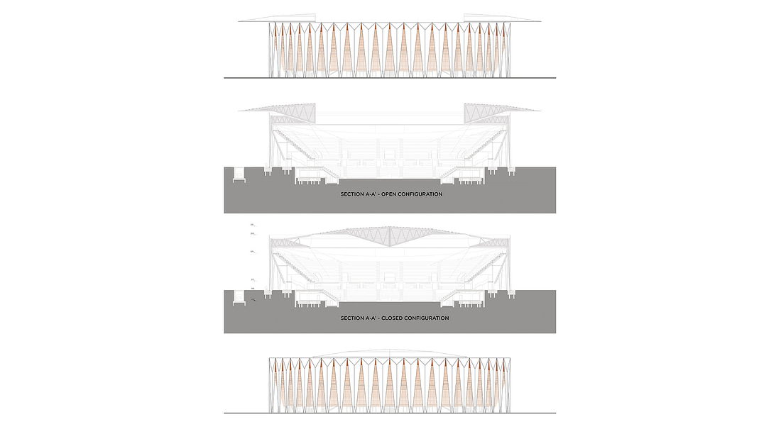 Una porzione della copertura fissa sarà di sezione triangolare in modo da poter essere sovrastata dalla copertura mobile senza dover raddoppiare l’altezza della struttura e quindi aumentare l’impatto visivo dell’intero stadio.