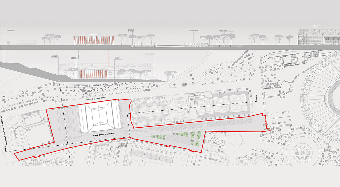 Al piano interrato ci sarà una rampa carrabile che partendo da via dei Gladiatori sfocerà sul lato sud del campo da tennis in modo da permettere l’accesso a ogni tipo di mezzo, specialmente per il montaggio di installazioni temporanee.