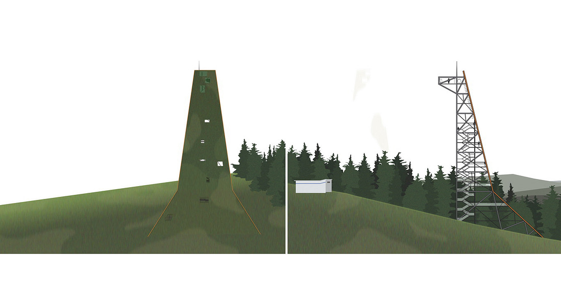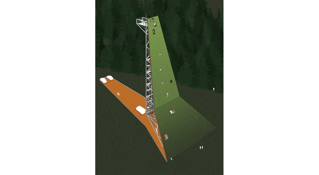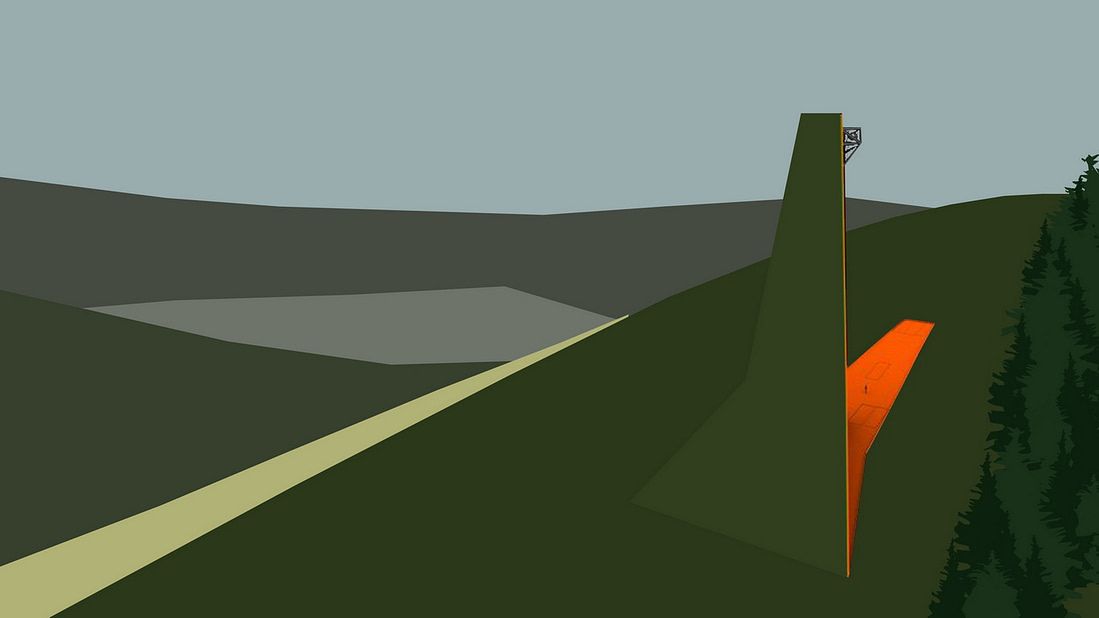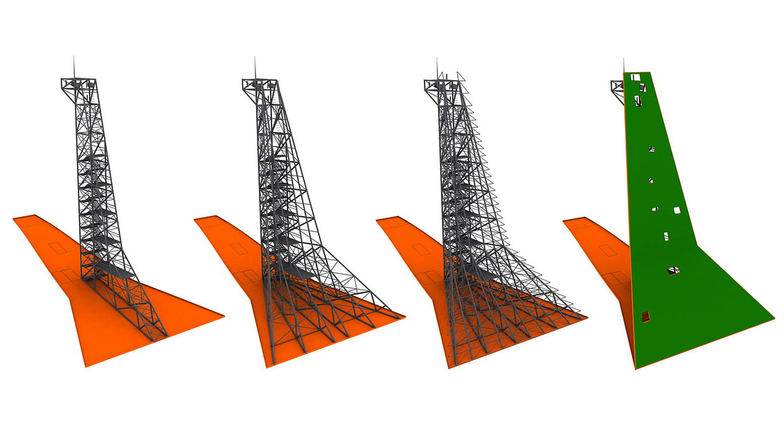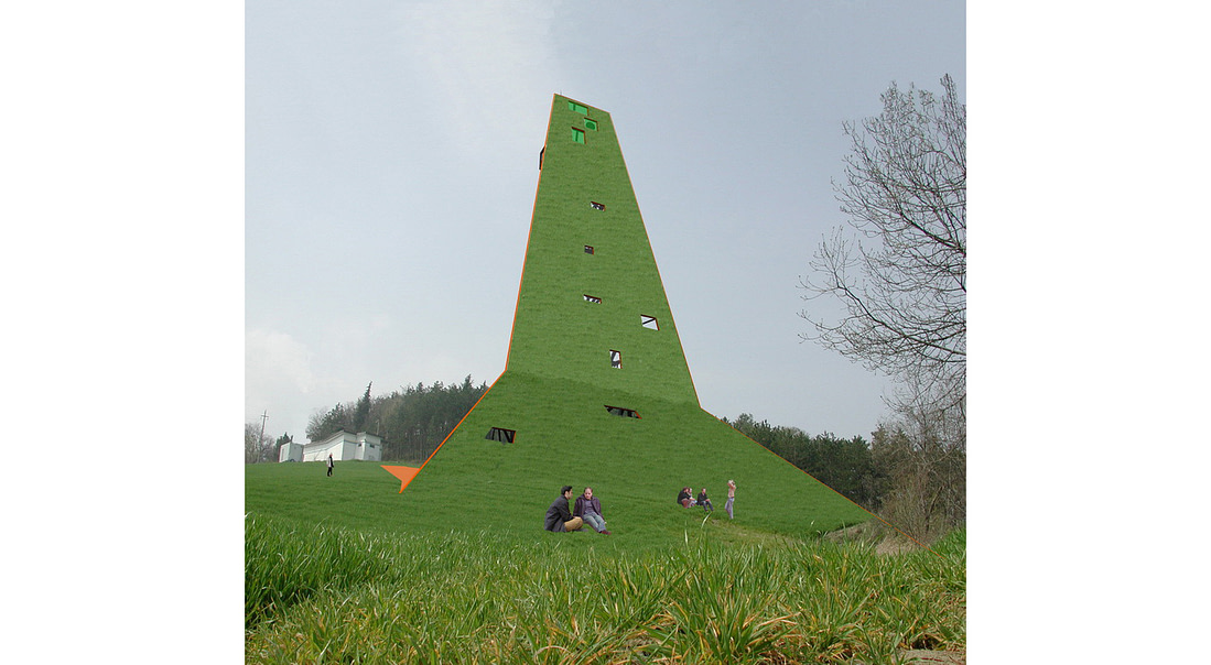 At night time the edges of the green skin would be illuminated by a series of neon lights to emphasize the metaphor of a strip of land that has risen up. In this way the tower would continue to be an orientation point for the surrounding area, even by night.